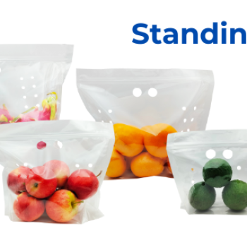 Standing Pouch bags with handle. Their bottom can be expanded and perforated for air passage. This product suitable for packing vegetables and fruits. Nowadays, the standing pouch bags are very popular because it’s convenient and easy to use. We have a special option for you to can customize your own logo brand for screen on the standing pouch bags to increase the value of your own product.